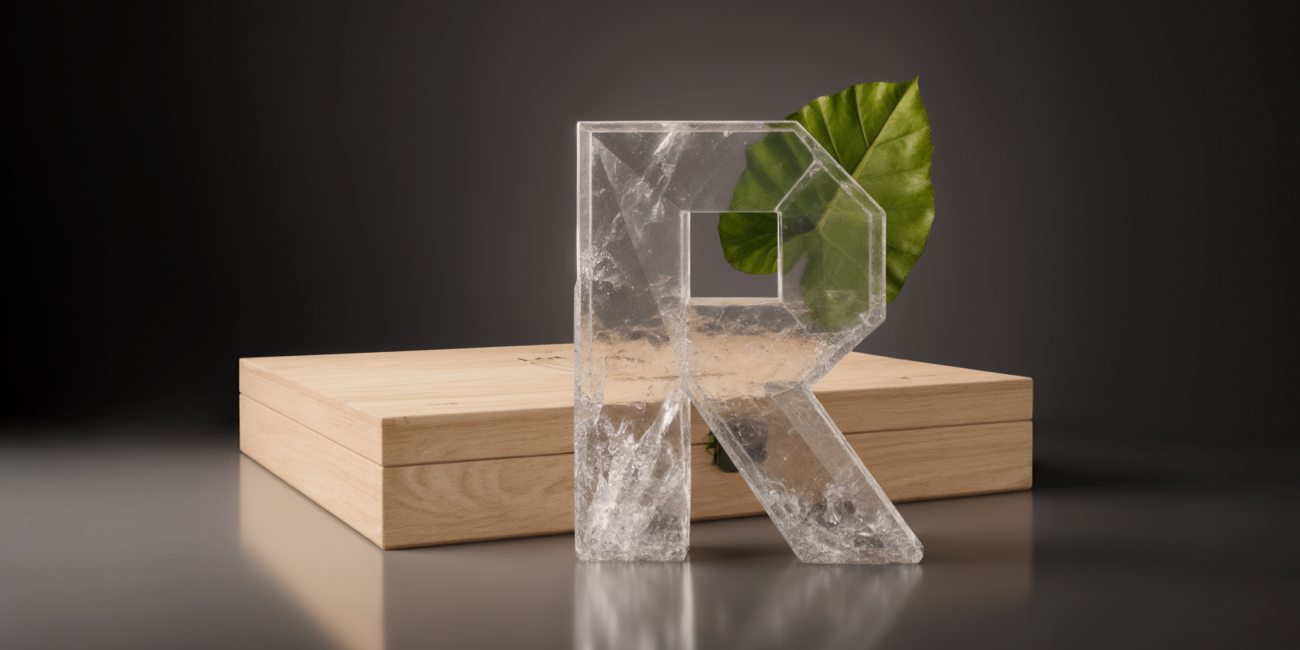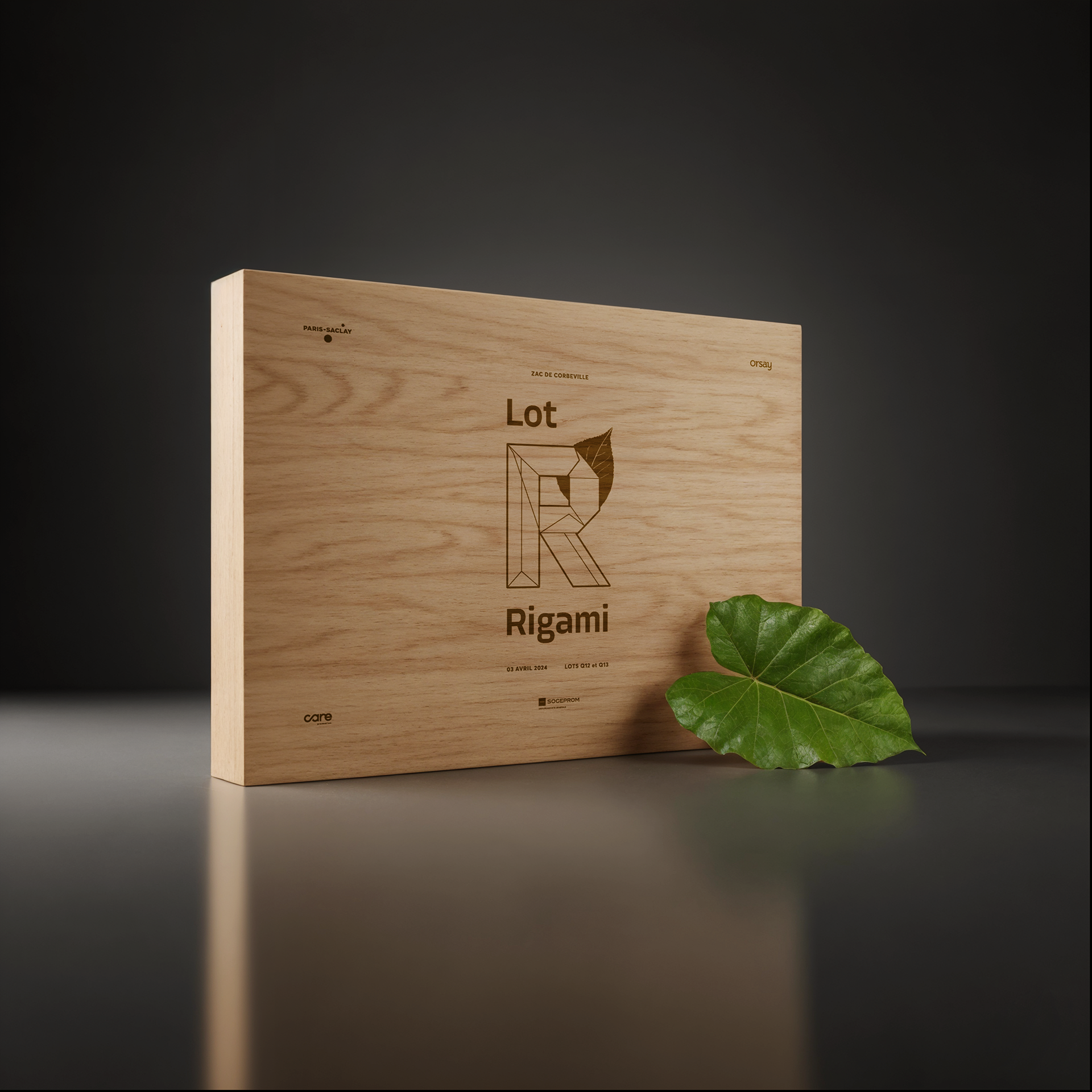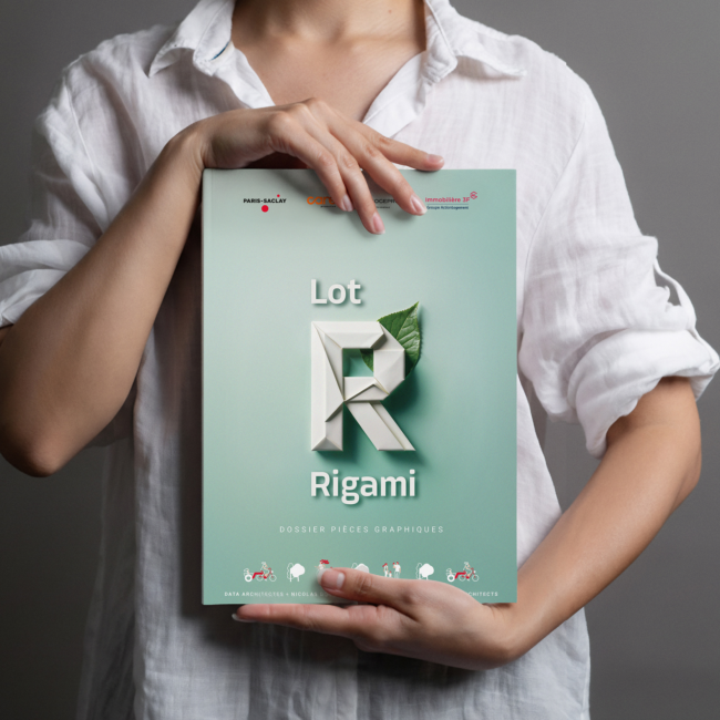 L’initiale de Rigami est construite en volume polygonal, faisant écho à la référence à l’origami. Une feuille se glisse derrière le monogramme en volume afin de rappeler l’intégration dans le paysage.
