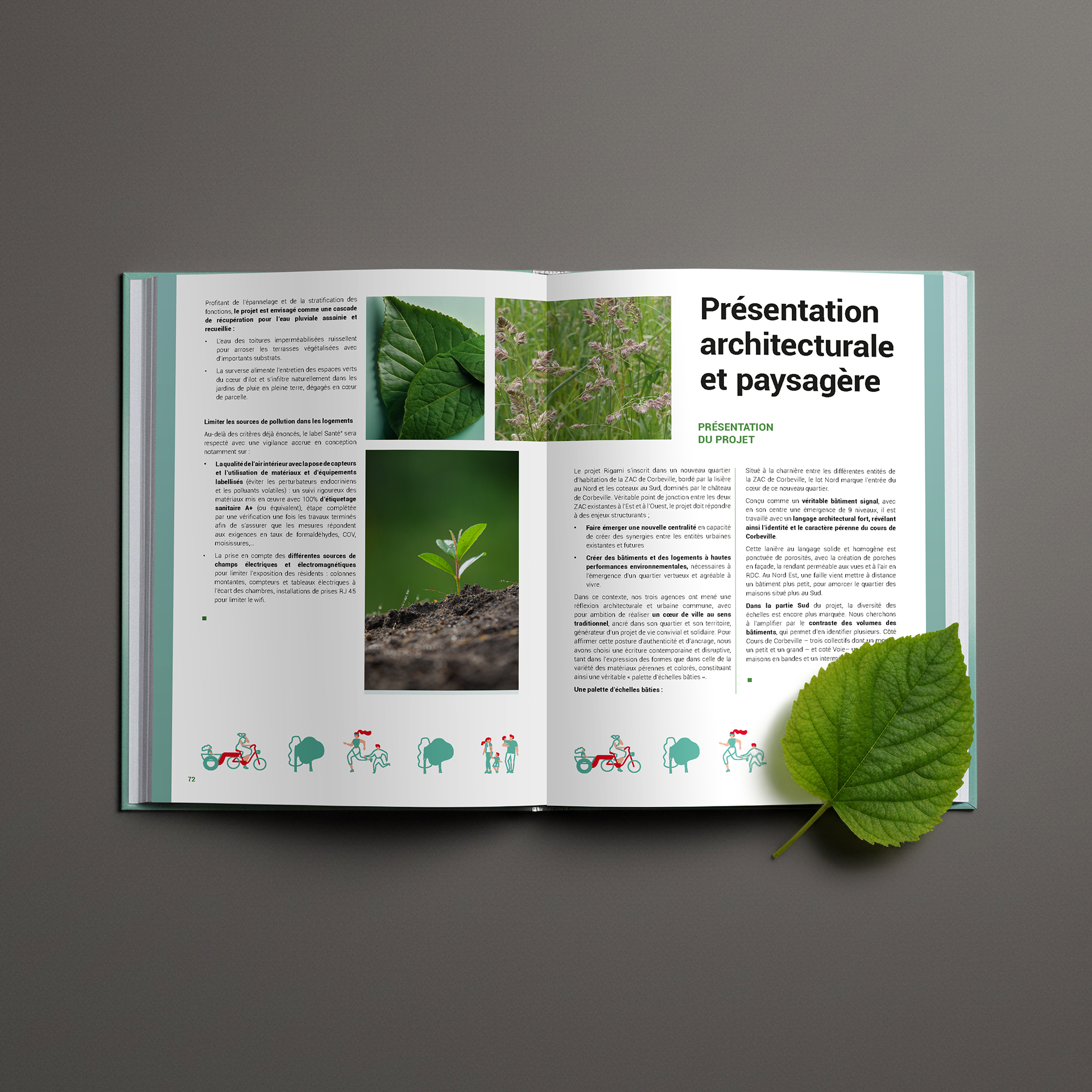 Les couleurs émeraude et rouge sont reprises de la phase 1, le vert pour l’aspect éco-responsable et intégré dans le paysage, le rouge pour l’humain, l’innovation et le rappel des logos SOGEPROM, CARE et SACLAY.